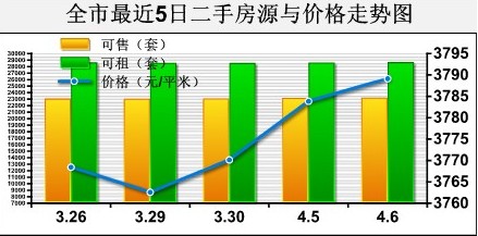 從走勢圖上可以看出:全市可售房源方面近五日整體呈現(xiàn)了穩(wěn)步上揚的走勢,尤其是經(jīng)過三天的清明假期,4月5日較3月30日增加了142套,今日仍然繼續(xù)攀升;全市可租房源近五日也整體呈現(xiàn)了穩(wěn)步上揚的走勢,4月5日較3月30日增加了114套,今日仍然繼續(xù)攀升;全市二手房掛牌均價走勢從圖上可以看出,清明節(jié)假期間出現(xiàn)持續(xù)大幅上漲,掛牌均價近五日整體呈現(xiàn)了持續(xù)上揚的走勢,今日繼續(xù)穩(wěn)步上漲。