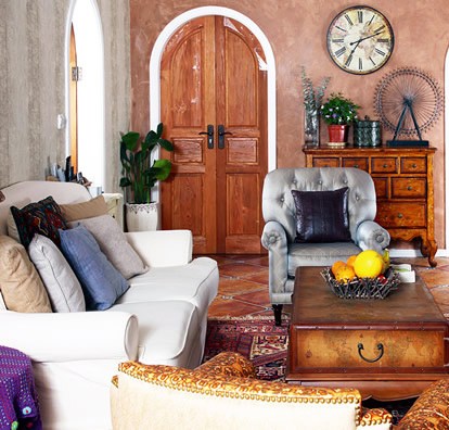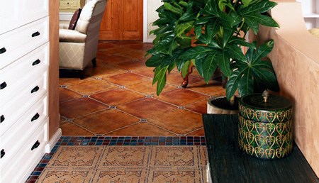 地面的鋪裝也是亮點(diǎn)之一?蛷d的大塊褐色意大利手工地磚與色彩絢麗的土耳其羊毛地毯交織出質(zhì)樸而溫暖的氛圍,在客廳與餐廳交接處,姜楠還以方格紋的褐色地磚來(lái)作為銜接與過(guò)渡,使客廳和餐廳以地材為界,既相互獨(dú)立,又隱為一體;廚房采用是產(chǎn)自泰國(guó)的牛皮色仿皮地磚,無(wú)論質(zhì)感和色彩,都與真正的牛皮頗有幾分相似;玄關(guān)的地磚則花色更為精致;尤其是浴室的地面,姜楠更是將混搭精神發(fā)揮到了極致。小小空間內(nèi)共采用了五種不同的素材,有意大利的,也有國(guó)產(chǎn)的,營(yíng)造出強(qiáng)烈的裝飾效果——在不同花色的地磚、馬賽克的包圍下,浴室仿佛融入了陽(yáng)光與活力,散發(fā)著濃郁的西班牙氣息。