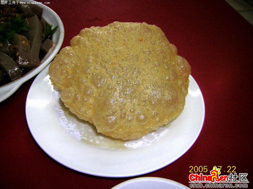 泡泡油糕色澤乳白,表皮蓬松,猶如輕紗織就,蟬翼作成,可謂巧奪天工。它之所以受到人們的青睞主要是因?yàn)樗闹谱鞣椒ㄓ兄?dú)到之處。平時(shí)人們吃的油條油餅蓬松發(fā)虛主要是因?yàn)殁C堿和面粉的配比恰當(dāng),放入熱油中所產(chǎn)生的二氧化碳?xì)怏w膨脹所致。而泡泡油糕既不放釩也不施堿,只是利用大油和水燙面,同樣蓬松漲發(fā)。它要求糕餅師一定要具有高超的技術(shù)和豐富的經(jīng)驗(yàn),大油、水、面的比例一定要恰倒好處,對油溫的要求也很嚴(yán)格,當(dāng)油糕投入到一定 溫度的油鍋內(nèi),內(nèi)部水蒸氣大量形成,氣體急劇上升的同時(shí),蛋白質(zhì)性變而展開,淀粉膨脹焦化,氣泡逐漸形成,并在高溫環(huán)境中固定下來,要求出鍋的油糕不落架(不蔫不癟)。 |