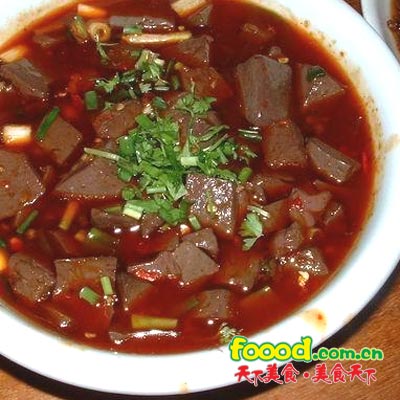 清晨,或是傍晚,食攤安在小巷街頭,擺設(shè)十分簡單,一個木架,架子上是各類碗盞,分別放在鹽、醬、醋、蒜水、油潑辣早晚不斷,一月后病子、香油。木架旁是一火爐,爐上有鍋,水開而不翻滾,鍋里煮的是切成小方塊的羊血。羊血撈在碗里,并無許多湯,加各類調(diào)料便可下口了:羊血鮮嫩湯味辣、嗆、咸,花椒、小茴香味竄撲鼻。