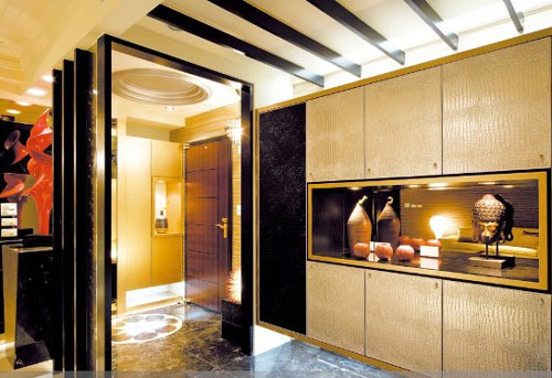 在玄關(guān)安置鏡面屋頂,搭配上美麗的壁燈,屋頂經(jīng)折射出的光彩讓居家熠熠生輝。