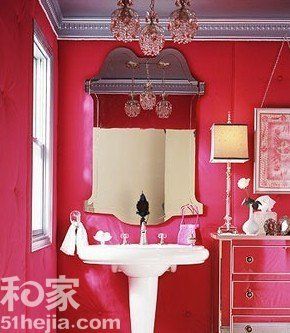 玫紅色的衛(wèi)浴間非常迷人,是許多女性的最愛。全身鏡面的浴室柜等大量的鏡面運用,增加了空間的視覺面積和通透感。衛(wèi)浴間里的潔具線條大都柔美,搭配上復古的水晶吊燈彰顯出生活的品味。
